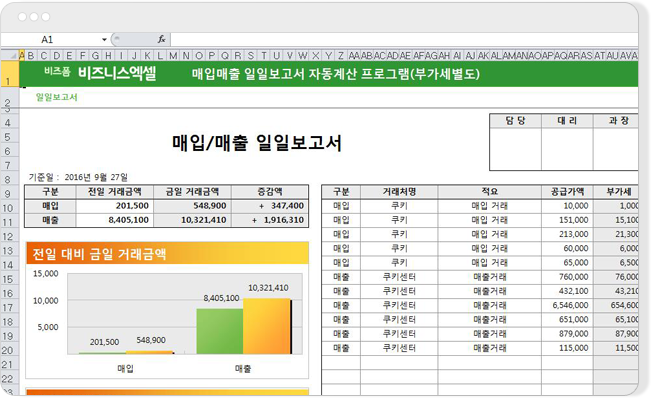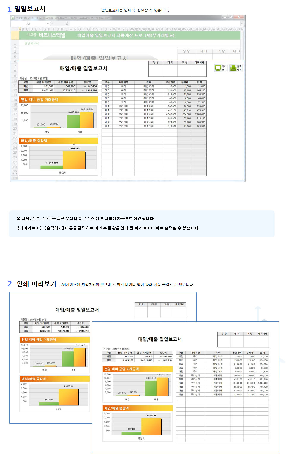 구성 : 일일보고서표준 엑셀문서와 간단한 자동계산 처리!매입매출 일일보고서 자동계산 프로그램(부가세별도)은 표준화된 엑셀문서에 다양한 계산을 자동으로 처리하고 버튼 클릭으로 간편하게 출력할 수 있는 자동계산 프로그램입니다.