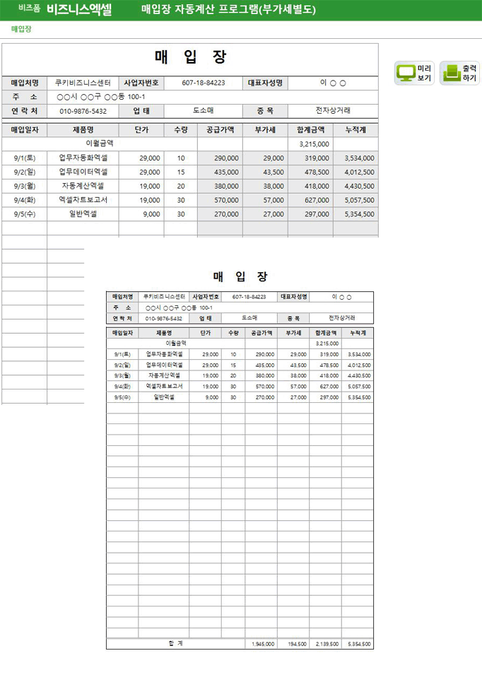구성 : 매입장표준 엑셀문서와 간단한 자동계산 처리!매입장 자동계산 프로그램(부가세별도)은 표준화된 엑셀문서에 다양한 계산을 자동으로 처리하고 버튼 클릭으로 간편하게 출력할 수 있는 자동계산 프로그램입니다.