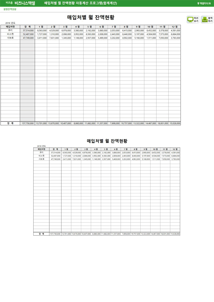 구성 : 월별잔액현황표준 엑셀문서와 간단한 자동계산 처리!매입처별 월 잔액현황 자동계산 프로그램(합계계산)은 표준화된 엑셀문서에 다양한 계산을 자동으로 처리하고 버튼 클릭으로 간편하게 출력할 수 있는 자동계산 프로그램입니다.