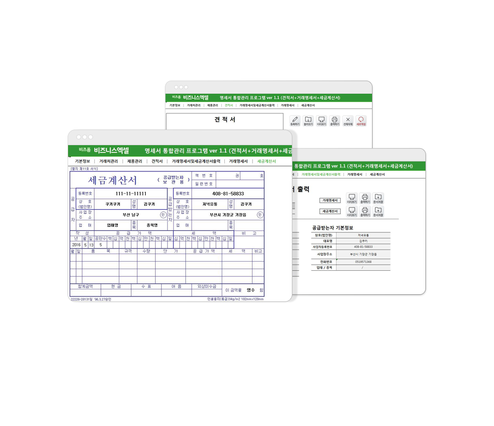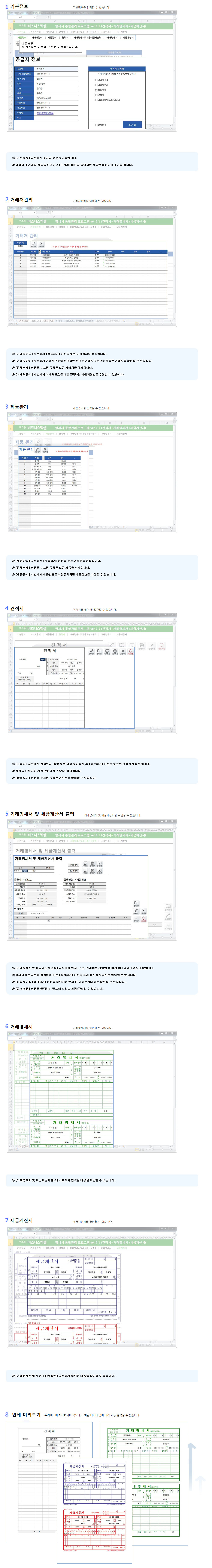 구성 : 기본정보, 거래처관리, 제품관리, 견적서, 거래명세서및세금계산서출력, 거래명세서, 세금계산서제품을 판매하기 위한 견적서 부터 거래명세서, 세금계산서까지 한번에 관리하고 출력할 수 있도록 구성된 프리미엄 업무자동화입니다. 이 업무자동화는 입력된 거래내역이 견적서와 거래명세서, 세금계산서로 서로 연동됩니다.※ 세금계산서 합계표 기능은 지원되지 않습니다.