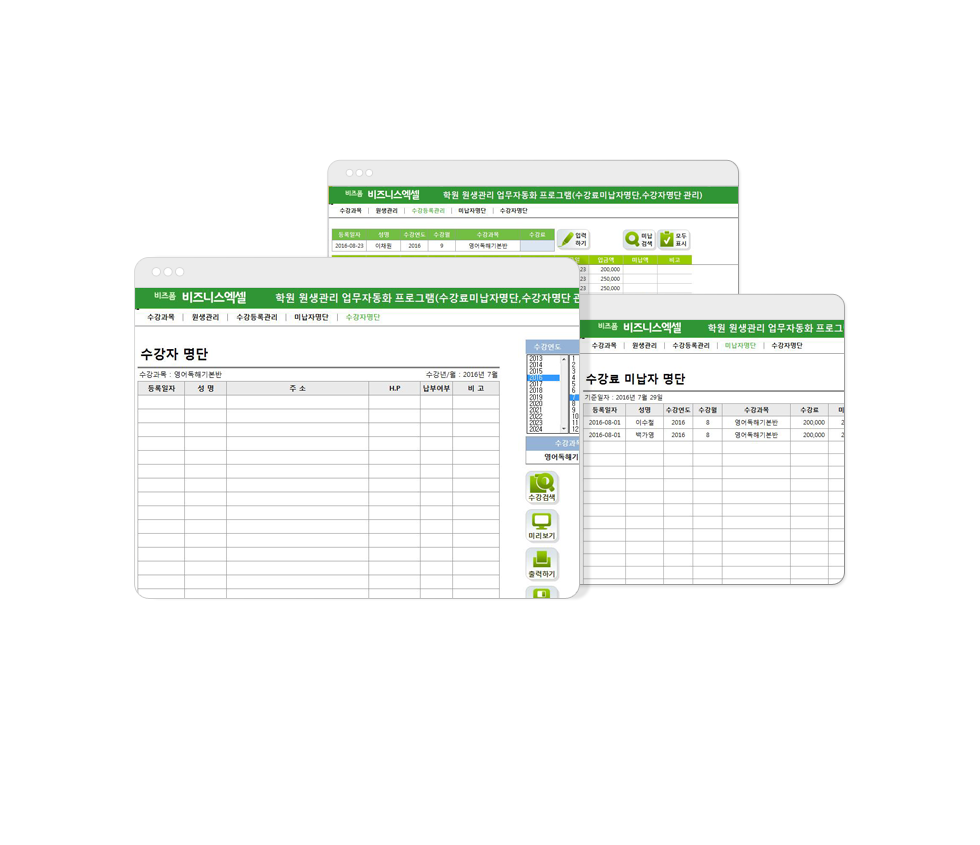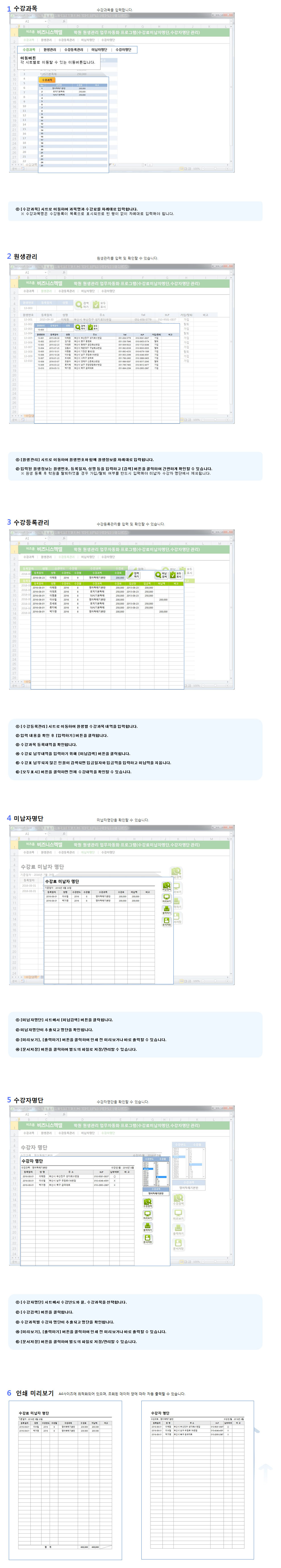 구성 : 수강과목,원생관리,수강등록관리,미납자명단,수강자명단학원 원생관리 업무자동화 프로그램은 수강과목별 수강등록을 이용하여 원생별 수강료를 관리할 수 있는 업무자동화 프로그램입니다.
