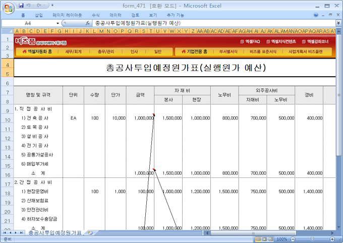 공사명별 단위, 수량, 단가, 금액, 자재비, 노무비, 외주공사비 등을 계산하는 자동계산입니다.