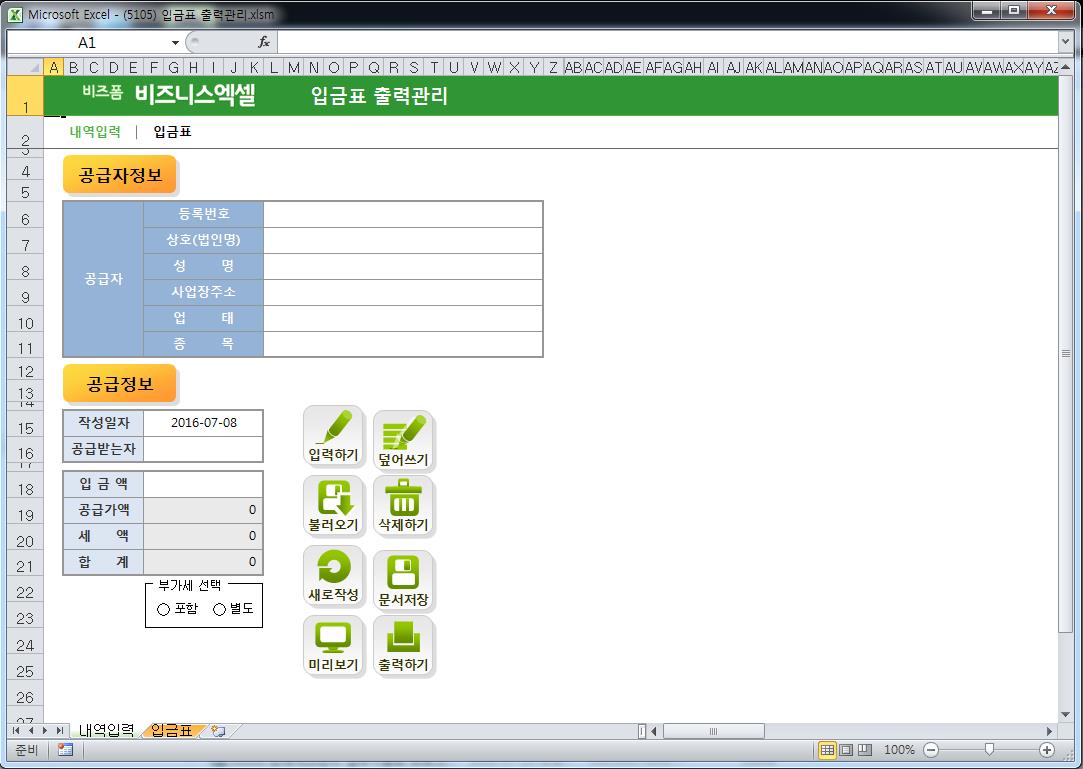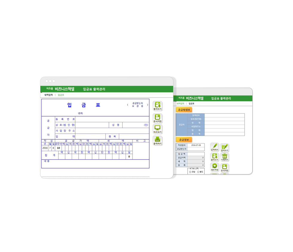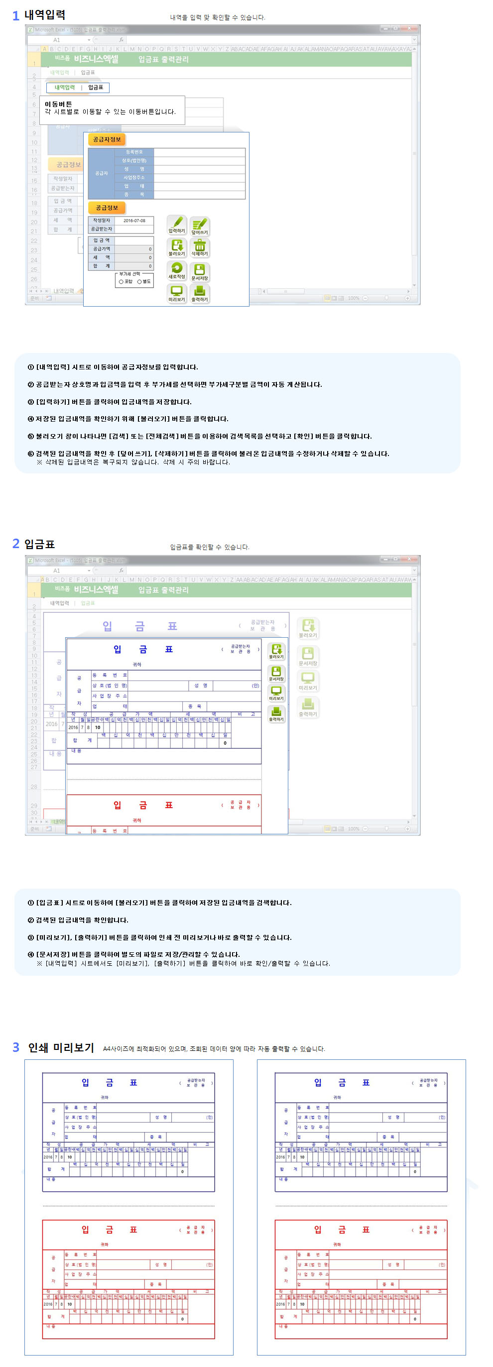 구성 : 내역입력,입금표입금표 작성과 저장을 한번에!입금표 출력관리 업무자동화 프로그램은 입금액을 부가세 구분에 따라 계산하고 저장하여 입금표로 출력/관리할 수 있는 업무자동화입니다.