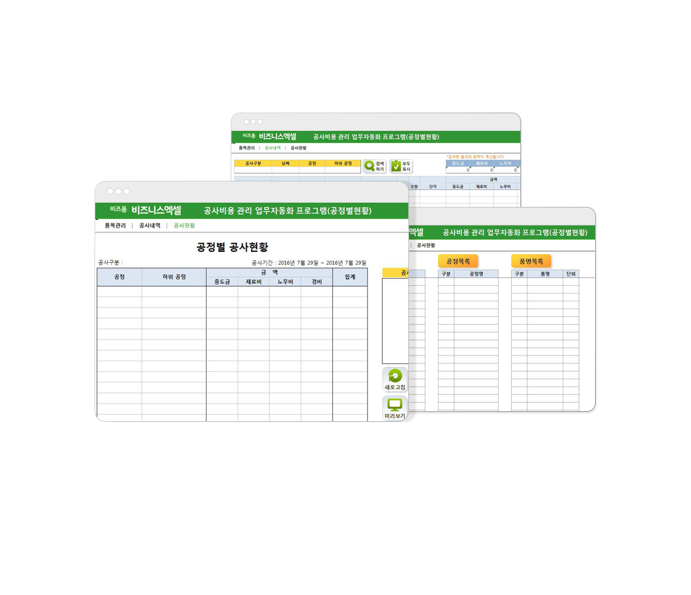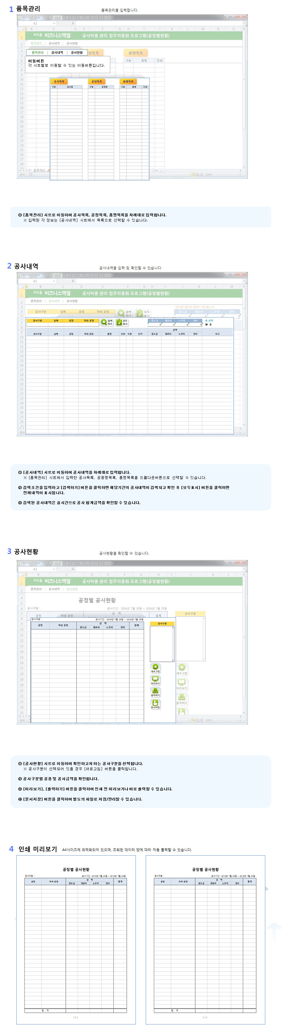구성 : 품목관리,공사내역,공사현황공사비용 관리 프로그램은 공사명과 공정별 공사금액을 입력하면 공사명별로 내역이 자동추출되어 현황표로 확인이 가능한 업무자동화 프로그램입니다.