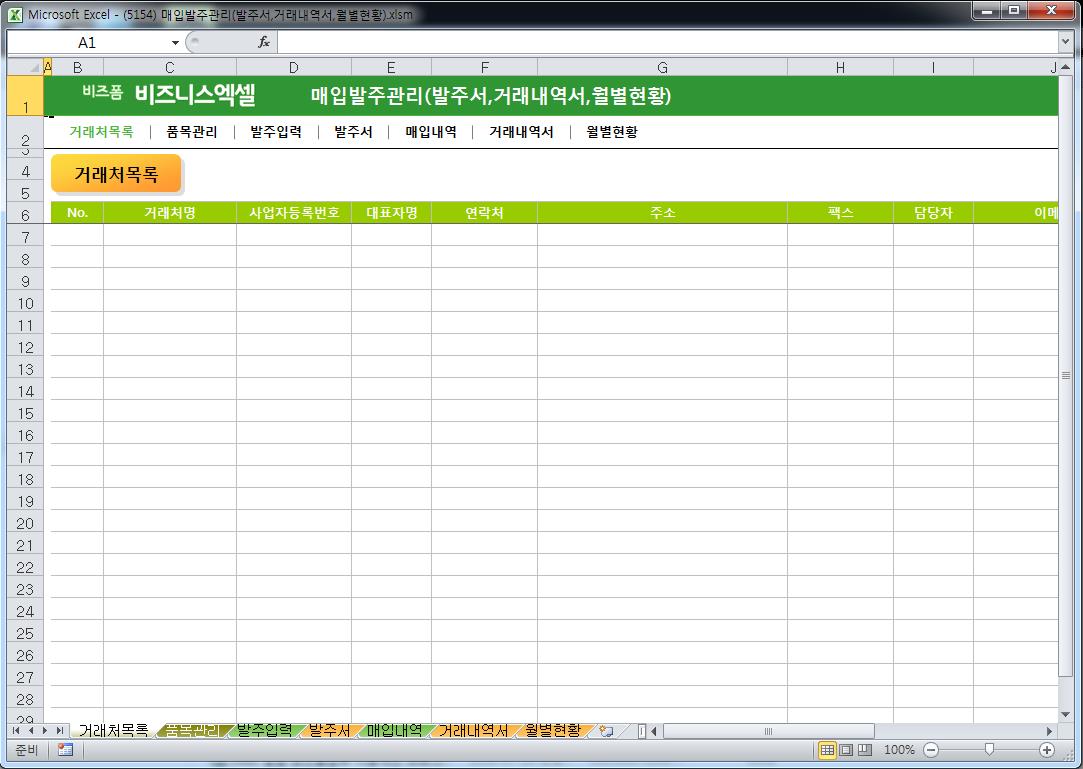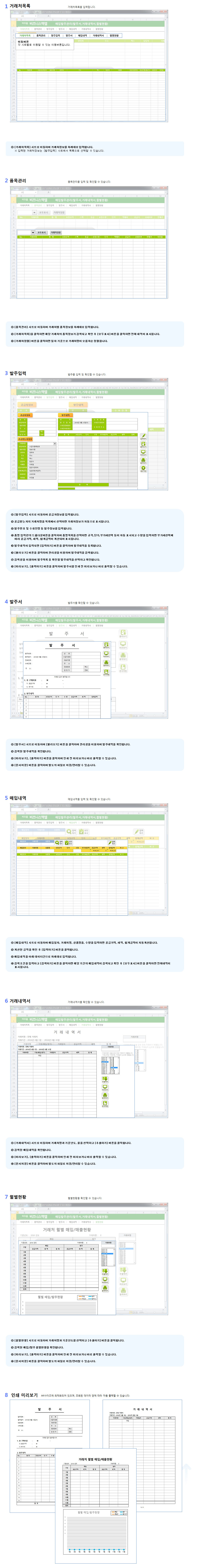 구성 : 거래처목록,품목관리,발주서,발주입력,매입내역,거래내역서,월별현황매입발주관리 프로그램은 발주내역을 작성하여 발주서를 발행하고 품목이 정상적으로 매입되면 거래내역을 작성하여 월별현황을 확인 가능한 업무자동화 입니다.