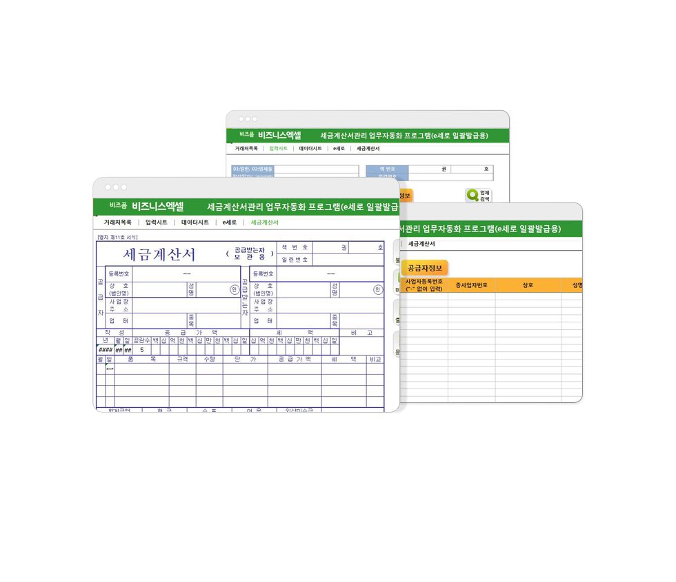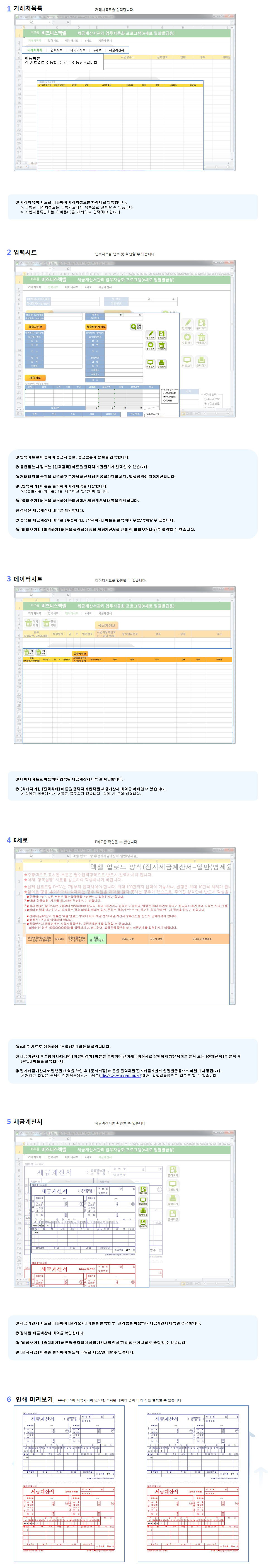 구성 : 거래처목록,입력시트,데이터시트,e세로,세금계산서세금계산서관리 프로그램은 매출내역에 대한 세금계산서 내역을 간편하게 입력하고 종이세금계산서와 전자세금계산서를 일괄발급이 가능한 업무자동화 입니다.