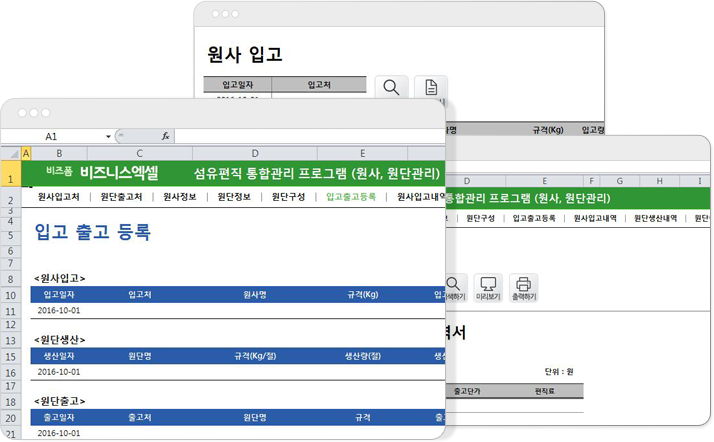 시트 구성 : 원사입고처, 원단출고처, 원사정보, 원단정보, 원단구성, 원사입고, 원단생산, 원단출고, 원사재고현황, 원단재고현황, 소요량산출, 편직료내역서, 청구서작업지시에 따른 거래처별 편직료 및 원사재고현황, 원단재고현황, 원사소요량산출을 하여 해당 거래처에 청구 할 수 있습니다.