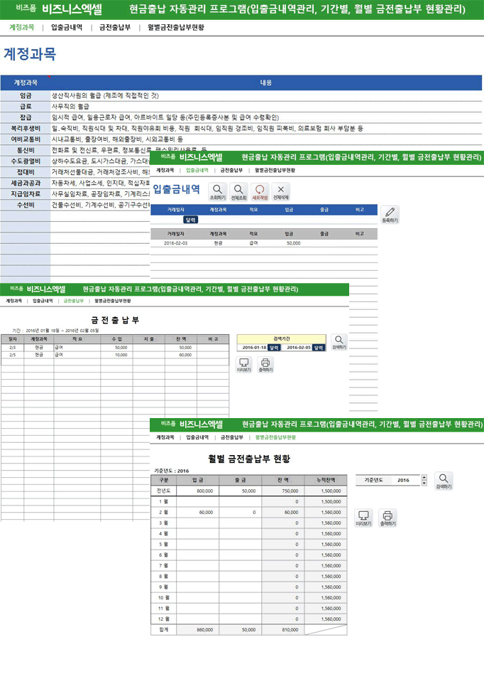 시트구성 : 계정과목, 입출금내역, 금전출납부, 월별금전출납부현황현금출납 자동관리 프로그램은 출납내역을 기간별, 월별로 간편히 관리할 수 있는 프로그램입니다.