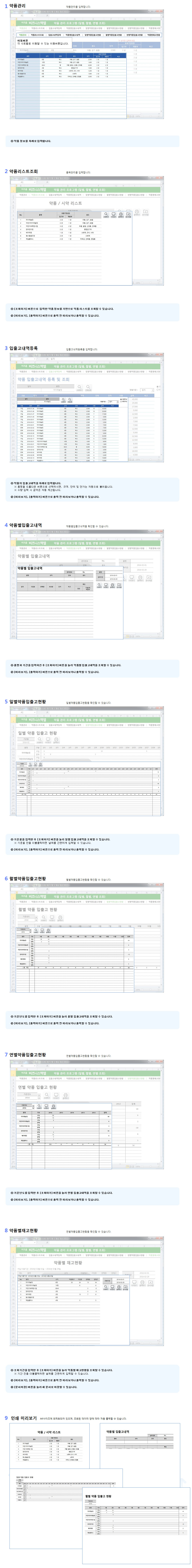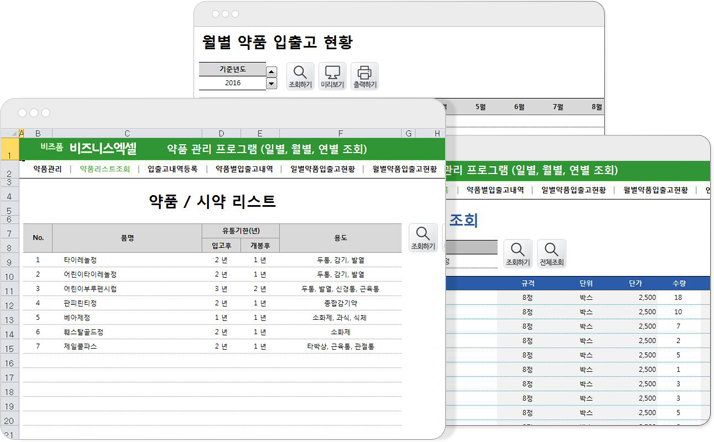 구성 : 약품관리,약품리스트조회,입출고내역등록,약품별입출고내역,약품별재고현황약품 입출고 내역과 제품별 재고 관리를 한번에!약품의 입고부터 출고, 기간별 사용량과 재고 현황을 자동으로 계산하고 관리할 수 있는 경영자동화 엑셀 프로그램입니다. 입력된 데이터는 약품리스트, 약품별재고현황, 약품내역서로 출력하여 사용할 수 있습니다.