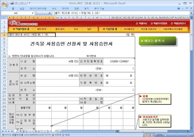 9,000원/월임시사용 층별에 대한 합계가 자동으로 계산되며 사용 시작일과 종료일에 대한 기간을 자동으로 산정해 줍니다.