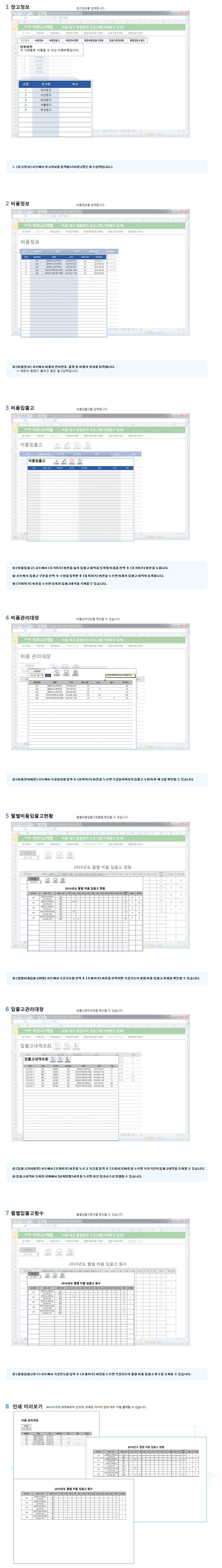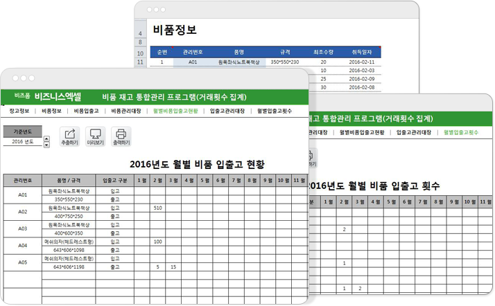 시트구성 : 창고정보, 비품정보, 비품입출고, 비품관리대장, 월별비품입출고현황, 입출고관리대장, 월별입출고횟수비품 통합관리 프로그램은 비품의 정보와 수량, 입출고 내역을 간편히 입력하여 재고현황을 간편하게 파악할 수 있는 프로그램입니다.