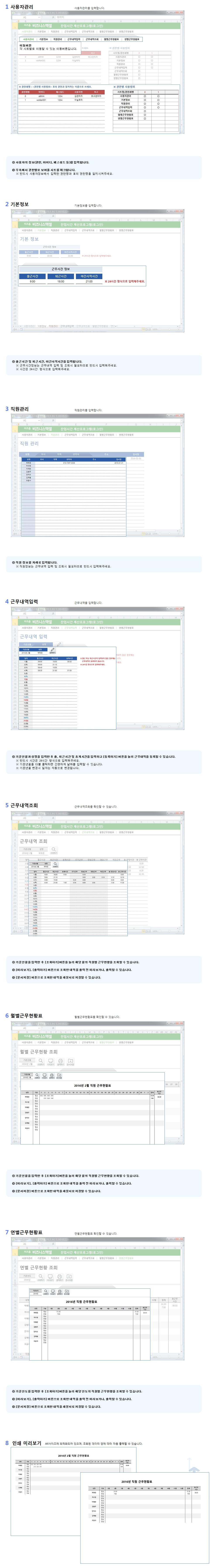 구성 : 기본정보, 직원관리, 근무내역입력, 근무내역조회, 월별근무현황, 연별근무현황, 로그인근무시간과 잔업시간 계산을 한번에!잔업시간 계산 프로그램은 출퇴근 시간 및 휴게시간을 입력하면 조기근무, 정상근무시간 및 잔업시간이 자동으로 계산되는 업무자동화 프로그램입니다.월별근무현황표와 연별근무현황표로 해당 기간의 직원별 근무현황을 조회할 수 있습니다.