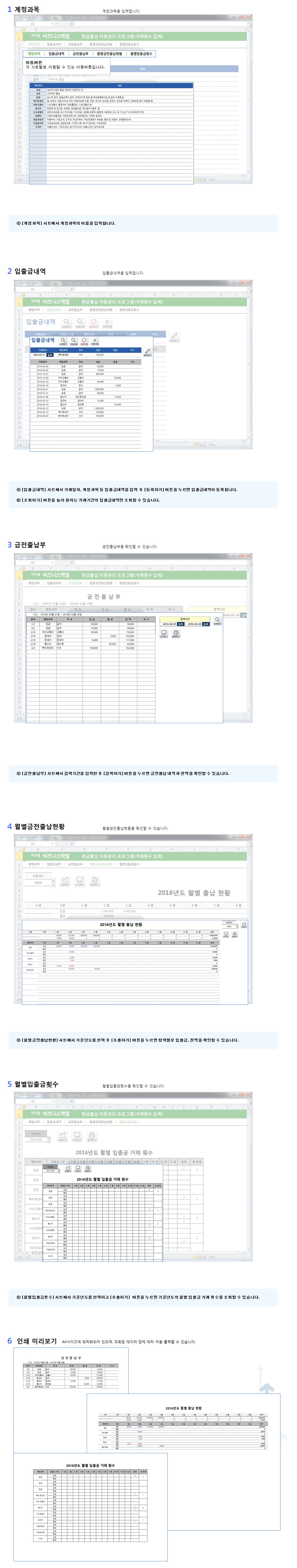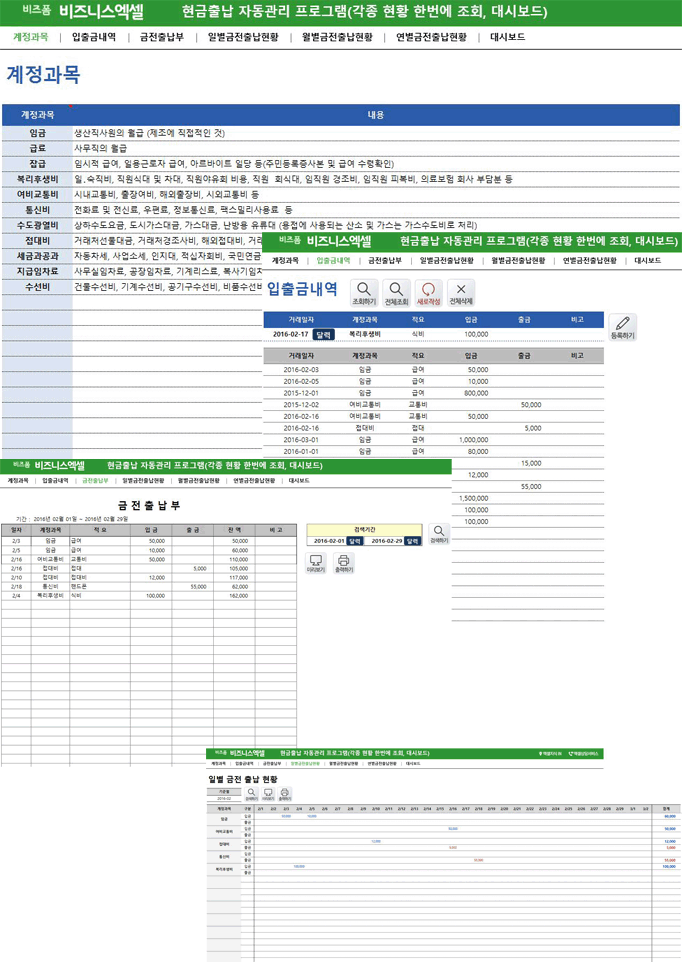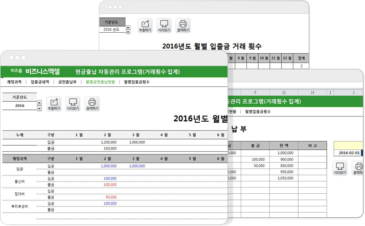시트구성 : 계정과목, 입출금내역, 금전출납부, 월별금전출납현황, 월별거래횟수현금출납 자동관리 프로그램은 출납내역을 기간별, 월별로 간편히 관리하며, 월별, 계정과목별로 조회할 수 있는 프로그램입니다.