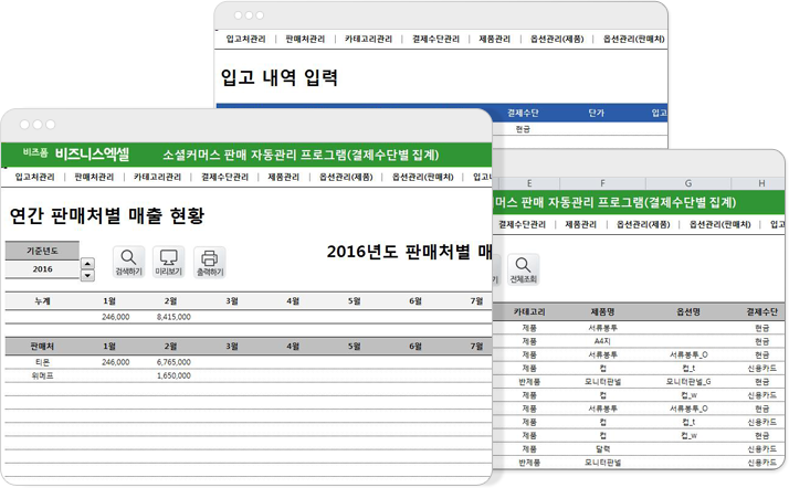 시트구성 : 입고처관리, 판매처관리, 카테고리관리, 결제수단관리, 제품관리, 옵션관리(제품), 옵션관리(판매처), 입고내역입력, 판매내역입력, 매입매출조회, 제품별재고현황, 제품별월간총매출현황, 판매처별매출현황, 결제수단별매출현황이 프로그램은 동일한 제품을 여러 사이트에서 다른 이름, 다른 가격으로 판매하시는 분들께 제품별 총 판매수량, 총 판매금액을 쉽게 자동으로 정산, 연별, 월별, 일별로 판매내역을 조회할 수 있는 자동화 지원 프로그램입니다.