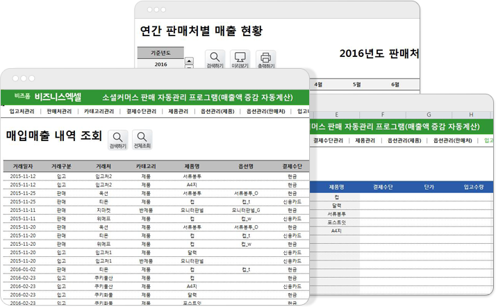 시트구성 : 입고처관리, 판매처관리, 카테고리관리, 결제수단관리, 제품관리, 옵션관리(제품), 옵션관리(판매처), 입고내역입력, 판매내역입력, 매입매출조회, 제품별재고현황, 제품별월간총매출현황, 판매처별매출현황, 월별매출증감현황이 프로그램은 동일한 제품을 여러 사이트에서 다른 이름, 다른 가격으로 판매하시는 분들께 제품별 총 판매수량, 총 판매금액을 쉽게 자동으로 정산, 연별, 월별, 일별로 판매내역을 조회할 수 있는 자동화 지원 프로그램입니다.