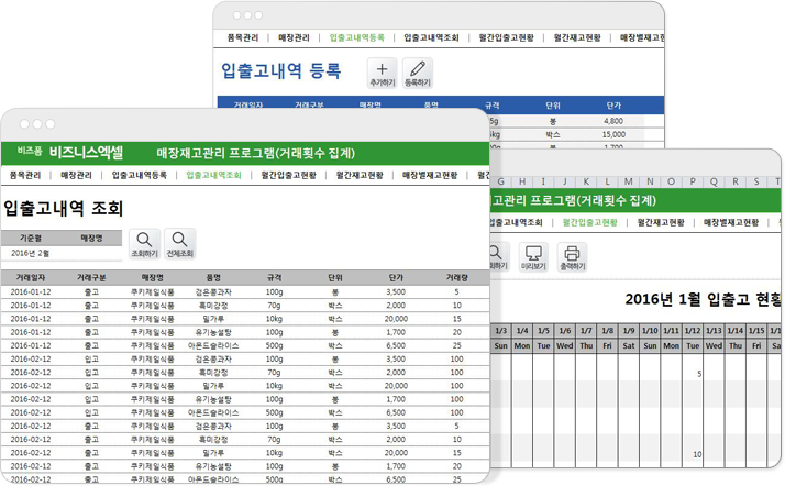 구성 : 품목관리, 매장관리, 입출고내역등록, 입출고내역조회, 월간입출고현황, 월간재고현황, 매장별재고현황, 월간입출고횟수매장별 입출고내역을 간편하게 등록하고 조회할 수 있습니다.등록한 입출고내역을 바탕으로 품목별/매장별로 월간 재고현황 및 입출고현황을 조회할 수 있습니다.