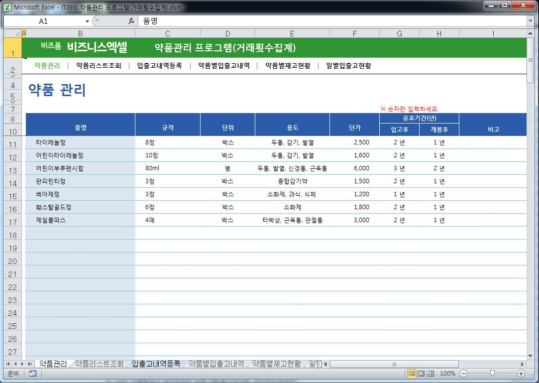 구성 : 약품관리,약품리스트조회,입출고내역등록,약품별입출고내역,약품별재고현황, 일별입출고현황(거래횟수집계)약품 입출고 내역과 제품별 재고 관리를 한번에!약품의 입고부터 출고, 기간별 사용량과 재고 현황을 자동으로 계산하고 관리할 수 있는 경영자동화 엑셀 프로그램입니다. 입력된 데이터는 약품리스트, 약품별재고현황, 약품내역서로 출력하여 사용할 수 있습니다.