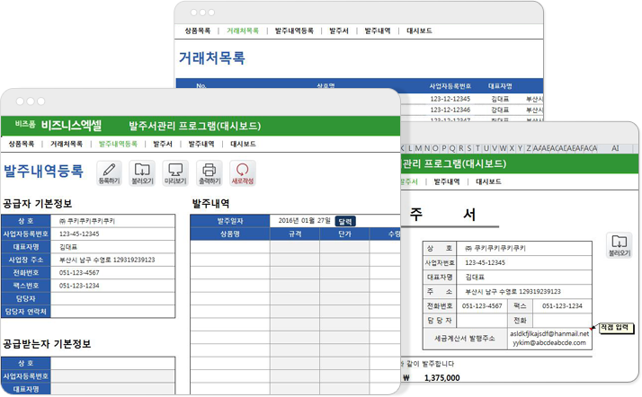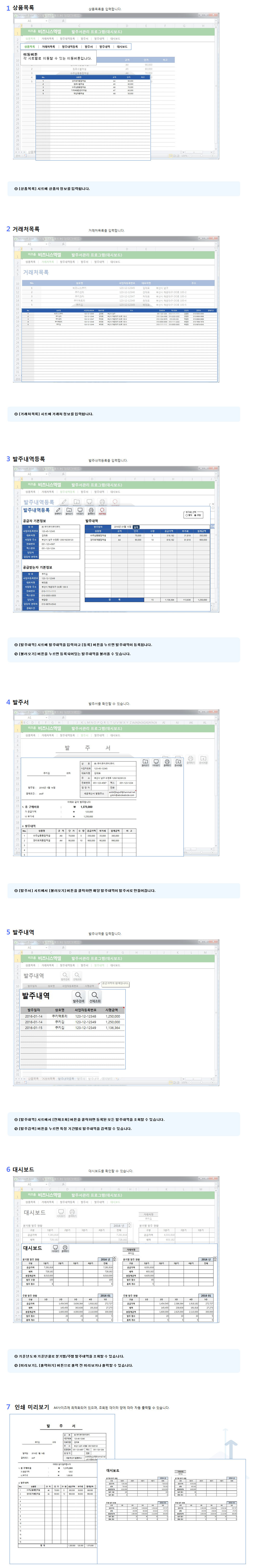 시트구성 : 상품목록, 거래처목록, 발주내역등록, 발주서, 발주내역발주서 관리(상품목록, 발주내역 관리) 업무자동화 프로그램은 발주내역을 쉽게 관리할 수 있는 프로그램입니다.