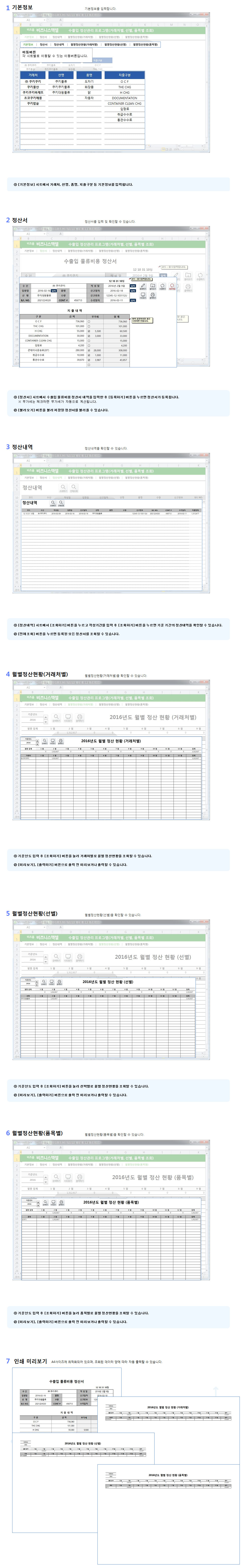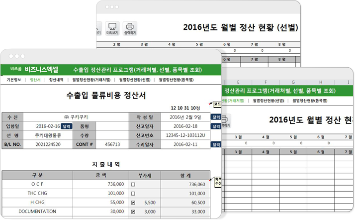 시트구성 : 기본정보, 정산서, 정산내역, 거래처별 월별정산현황, 선별 월별정산현황, 품목별 월별정산현황 수출입 정산관리 프로그램은 물류비용을 관리, 월별로 정산현황을 확인할 수 있는 프로그램입니다.