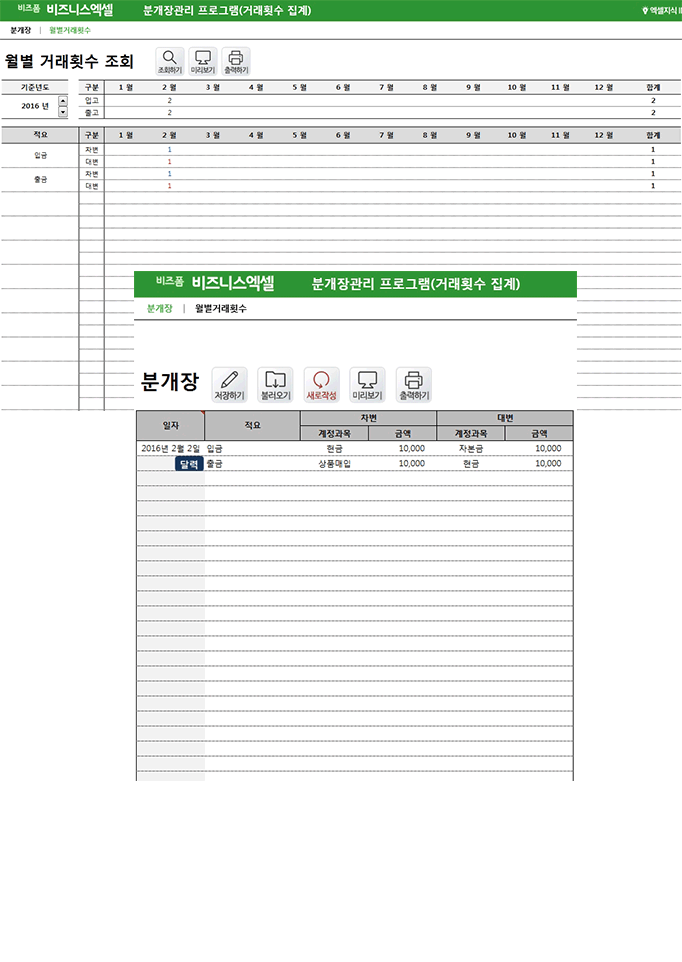 시트구성 : 분개장, 월별거래횟수간편 분개장관리 업무자동화 프로그램은 일별로 입출금 관리가 가능한 업무자동화 프로그램입니다.