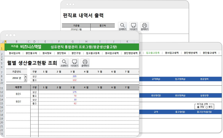 시트 구성 : 원사입고처, 원단출고처, 원사정보, 원단정보, 원단구성, 원사입고, 원단생산, 원단출고, 원사재고현황, 원단재고현황, 소요량산출, 편직료내역서, 청구서, 월별생산출고현황작업지시에 따른 거래처별 편직료 및 원사재고현황, 원단재고현황, 원사소요량산출을 하여 해당 거래처에 청구 할 수 있습니다.