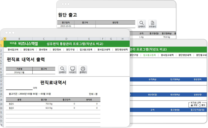 시트 구성 : 원사입고처, 원단출고처, 원사정보, 원단정보, 원단구성, 원사입고, 원단생산, 원단출고, 원사재고현황, 원단재고현황, 소요량산출, 편직료내역서, 청구서, 작년도월별거래비교작업지시에 따른 거래처별 편직료 및 원사재고현황, 원단재고현황, 원사소요량산출을 하여 해당 거래처에 청구 할 수 있습니다.