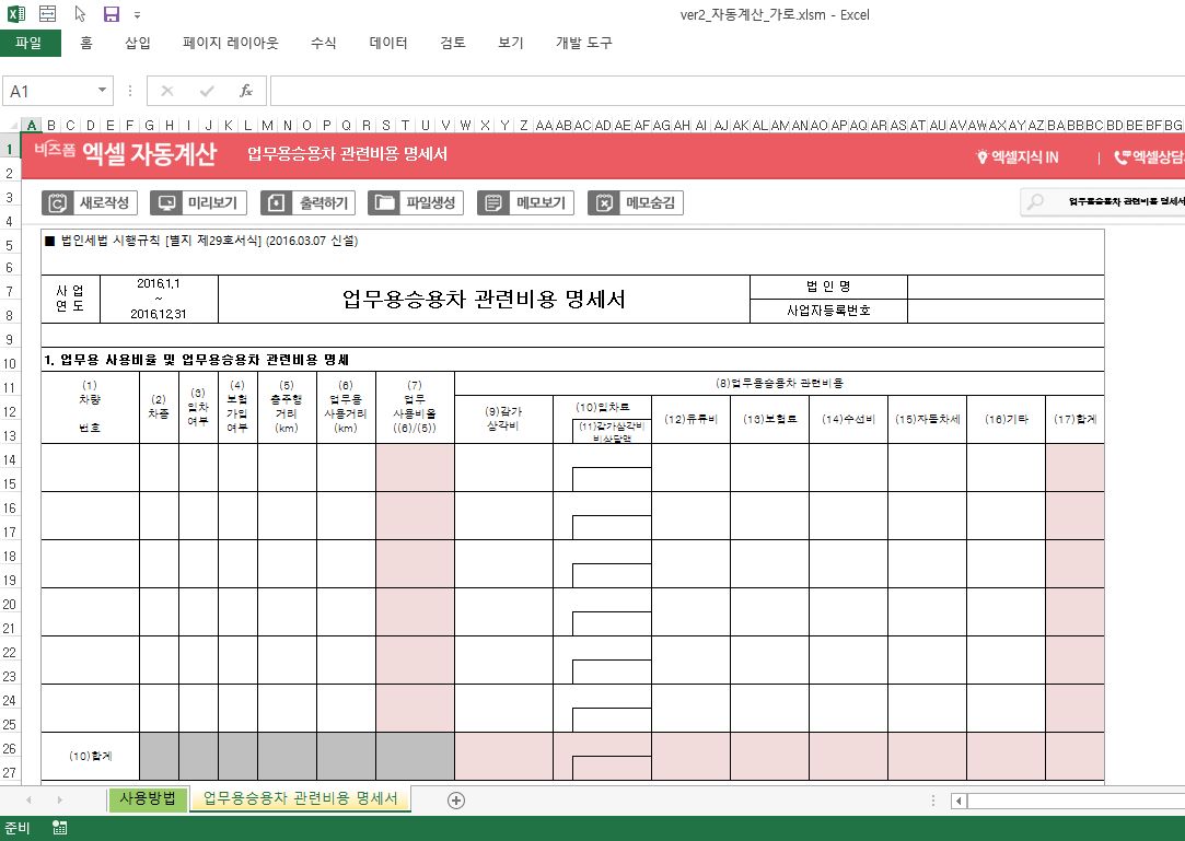 업무용승용차관련비용명세서 입니다. 업무용 사용비율 및 업무용승용차 관련비용 명세(차량번호, 차종, 임차여부, 보험가입여부, 총주행거리, 업무용사용거리, 업무사용비율, 감가상각비, 임차료, 감가삼각비 비상당액, 유류비, 수선비, 자동차세, 기타, 합계), 업무용승용차 관련비용 손금불산입 계산(차량번호, 감가상각비, 관련비용, 합계, 감가상각비 한도초과금액, 손금불산입 합계, 손금산입합계), 감가상각비(상당액) 한도초과금액 이월명세(차량번호, 차종, 취득일, 전기이월액, 당기 감가상각비 한도초과금액, 감가상각비 한도초과금액 누계, 손금추인액, 차기이월액), 업무용승용차 처분손실 및 한도초과금액 필요경비불산입액 계산(차량번호, 양도가액, 취득가액, 감가상각비 누계약, 감가상각비 한도초과금액 차기이월액, 합계, 처분손실, 당기손금산입액, 한도초과금액 손금불산입), 업무용승용차 처분손실 한도초과금액 이월명세(차량번호, 차종, 처분일, 전기이월액, 손금산입액, 차기이월액) 등으로 구성되어 있습니다. 각 항목별 금액을 입력하면 잔액액이 자동계산되어지는 엑셀자동계산 서식입니다.