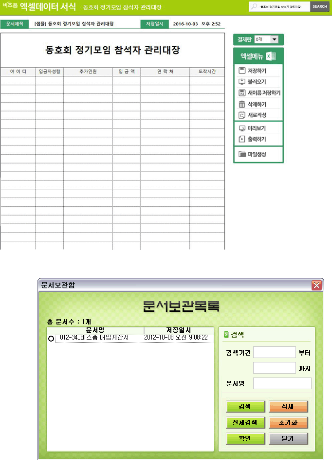 동호회정기모임참석자관리대장 입니다. 아이디, 입금자성함, 추가인원, 입금액, 연락처, 도착시간 등의 항목으로 구성되어 있습니다. 작성 건별로 데이터 누적, 저장, 수정, 불러오기, 별도 파일로 저장이 가능한 엑셀 데이터 서식입니다.