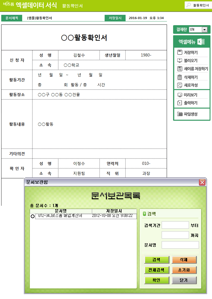 활동확인서 입니다. 신청자(성명, 생년월일, 소속), 활동기간, 활동장소, 활동내용, 기타의견, 확인자(성명, 연락처, 소속, 직위) 등의 항목으로 구성되어 있습니다. 작성 건별로 데이터 누적, 저장, 수정, 불러오기, 별도 파일로 저장이 가능한 엑셀 데이터 서식입니다.