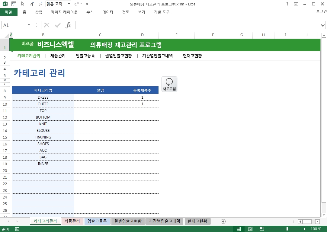 | 서식목차 | 카테고리관리, 제품관리, 입출고등록, 월별입출고현황, 기간별입출고내역, 현재고현황 |
