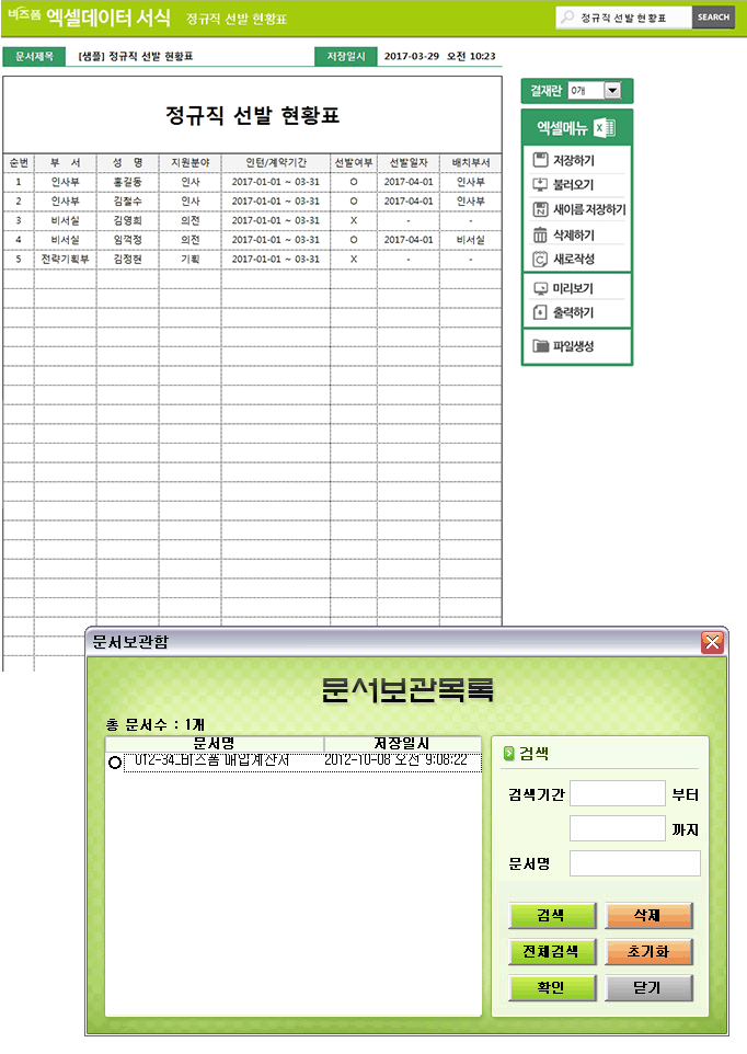 정규직선발현황표 입니다. 순번, 부서, 성명, 지원분야, 인턴/계약기간, 선발여부, 선발일자, 배치부서 등의 항목으로 구성되어 있습니다. 작성 건별로 데이터 누적, 저장, 수정, 불러오기, 별도 파일로 저장이 가능한 엑셀 데이터 서식입니다.