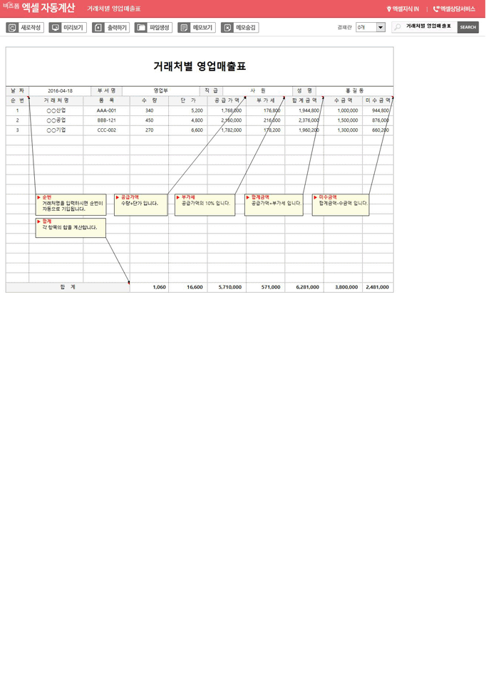 거래처별영업매출현황 입니다. 날짜, 부서명, 직급, 성명, 순번, 거래처명, 품목, 수량, 단가, 공급가액, 부가세, 합계금액, 수금액, 미수금액 등으로 구성되어 있습니다. 각 항목을 입력하면 합계가 자동계산되어지는 엑셀자동계산 서식입니다.