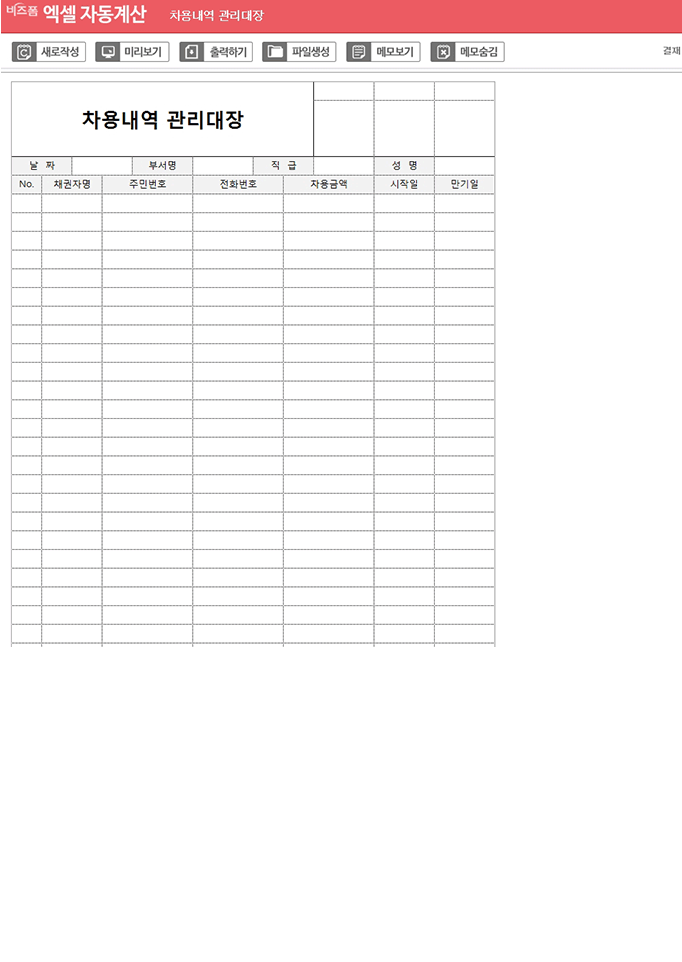 차용내역관리대장(세로형) 입니다. 날짜, 부서명, 직급, 성명, No, 채권자명, 주민번호, 전화번호, 차용금액, 시작일, 만기일 등으로 구성되어 있습니다. 각 항목을 입력하면 합계가 자동계산되어지는 엑셀자동계산 서식입니다.