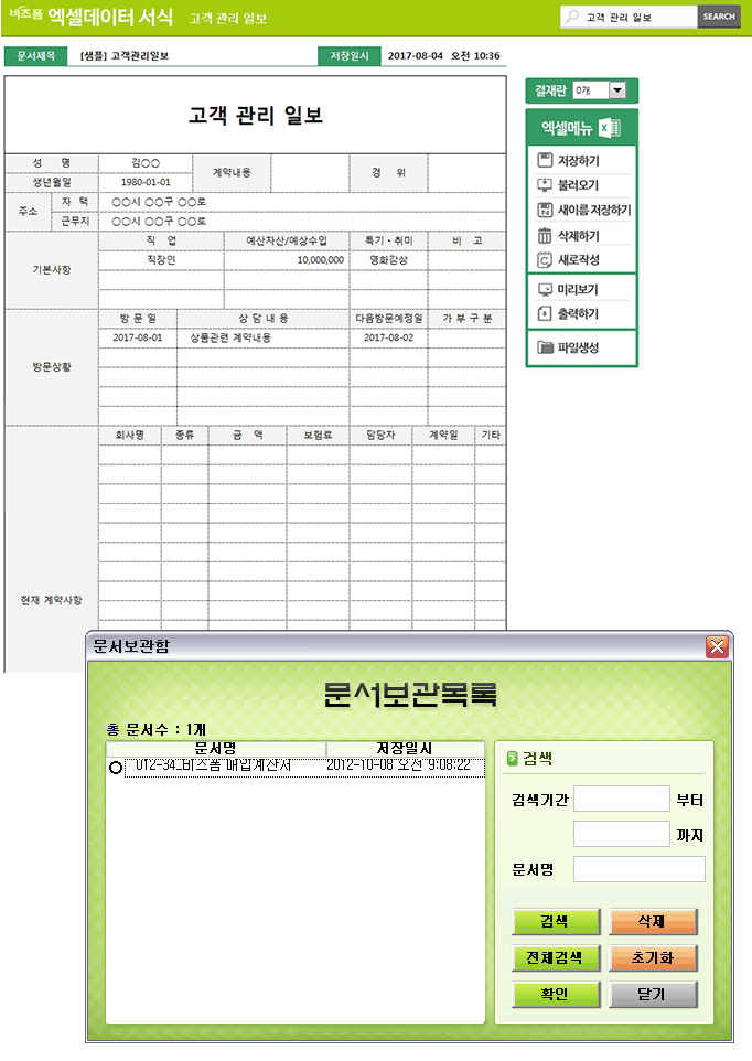 '고객관리일보 입니다. 성명, 생년월일, 계약내용, 경위, 주소(자택, 근무지), 기본사항(직업, 예산자산/예상수입, 특기ㆍ취미, 비고), 방문상황(방문일, 상담내용, 다음방문예정일, 가부구분), 현재계약사항(회사명, 종류, 금액, 보험료, 담당자, 계약일, 기타 등으로 구성되어 있습니다. 작성 건별로 데이터 누적, 저장, 수정, 불러오기, 별도 파일로 저장이 가능한 엑셀 데이터 서식입니다. '