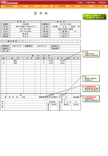 9,000원/월발주서의 상세한 내역을 작성할수 있으며 금액과 합계가 자동으로 계산됩니다.