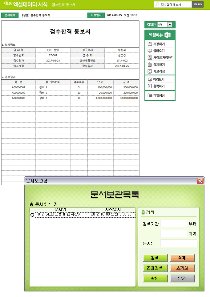 검수합격통보서 입니다. 업체정보(업체명, 청구부서, 발주번호, 접수자, 검수일자, 생산제품번호, 입고계정, 작성일자), 검수결과(품번, 품명, 검수수량, 단가, 금액) 등으로 구성되어 있습니다. 작성 건별로 데이터 누적, 저장, 수정, 불러오기, 별도 파일로 저장이 가능한 엑셀 데이터 서식입니다.