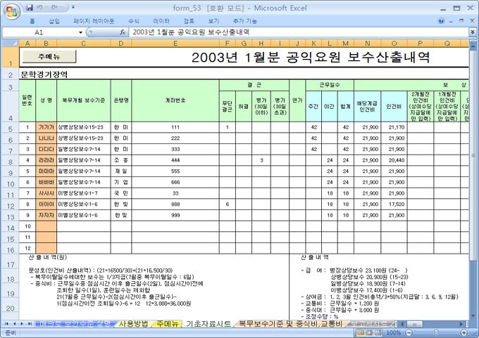 9,000원/월공익요원에 대한 요일별 근무명령서를 자동으로 계산하며 근무시 소요되는 보수에 대해 자동으로 계산될 수 있도록 만든 자동화서식입니다.
