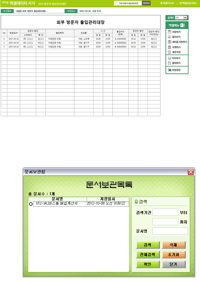 외부방문자출입관리대장 입니다. No, 방문일자, 방문자 확인(소속회사, 확인), 출입목적, 반입품, 시간(입실, 퇴실), 출입카드(번호), 접견자 확인(입실, 퇴실), 담당자 확인(카드반납) 등으로 구성되어 있습니다. 작성 건별로 데이터 누적, 저장, 수정, 불러오기, 별도 파일로 저장이 가능한 엑셀 데이터 서식입니다.