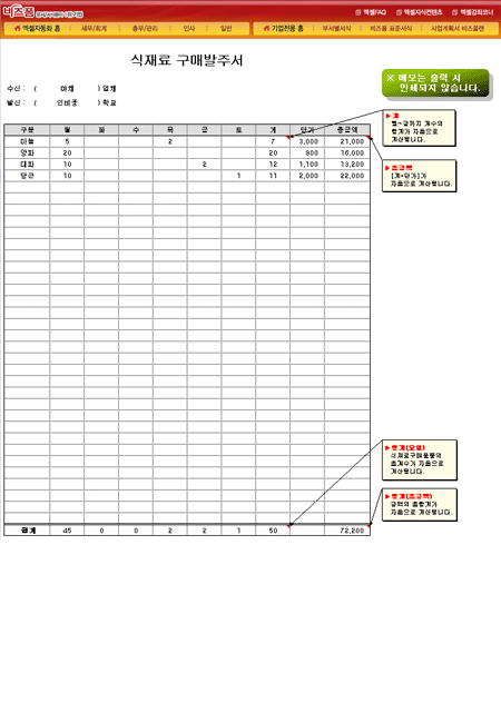 9,000원/월식재료를 요일별로 수요량과 단가로 총금액이 자동으로 계산되어지는 식재료구매발주서 자동계산 서식입니다.