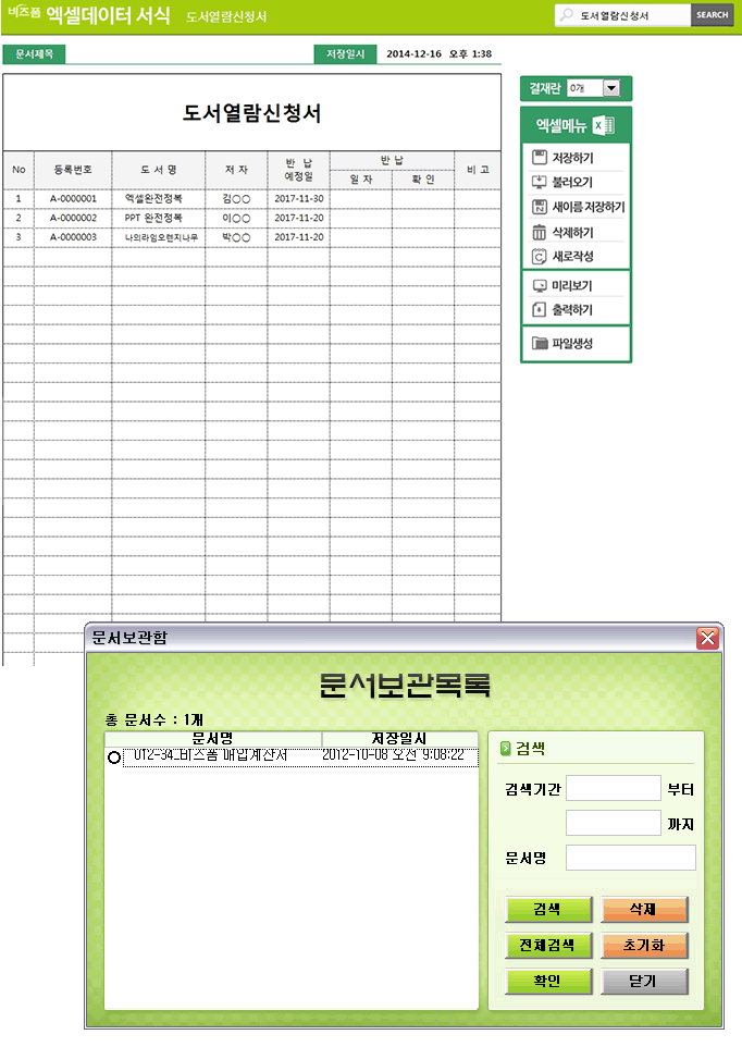 도서열람신청서 입니다. No, 등록번호, 도서명, 저자, 반납예정일, 반납(일자, 확인), 비고 등으로 구성되어 있습니다. 작성 건별로 데이터 누적, 저장, 수정, 불러오기, 별도 파일로 저장이 가능한 엑셀 데이터 서식입니다.