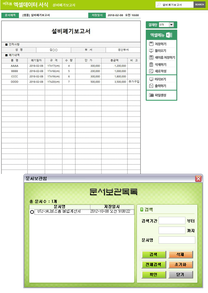 설비폐기보고서입니다. 성명, 부서, 품명, 폐기일자, 규격, 수량, 단가, 총금액, 비고 등으로 구성되어 있습니다. 작성 건별로 데이터 누적, 저장, 수정, 불러오기, 별도 파일로 저장이 가능한 엑셀 데이터 서식입니다.
