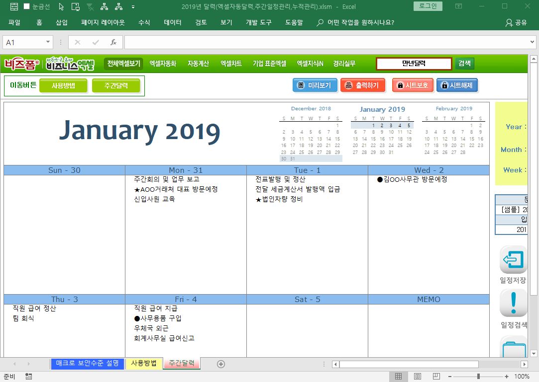 2019년 주간스케줄달력(주간일정저장)입니다.2019년 달력을 주단위로 업무 및 스케줄을 작성할 수 있습니다.일정 및 스케줄은 주 단위로 저장, 검색, 삭제를 할 수 있으며 원하는 주 단위로 출력할 수 있습니다.