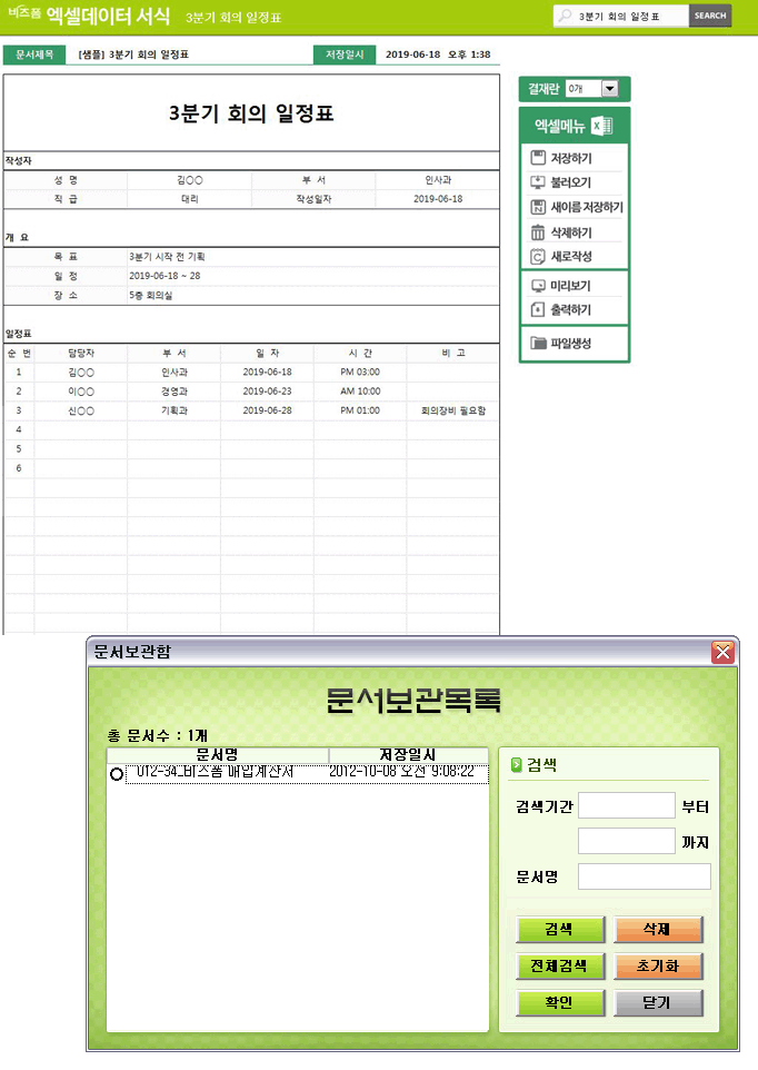 3분기회의일정표입니다. 성명, 부서, 직급, 작성일자, 목표, 일정, 장소, 순번, 담당자, 부서, 일정, 시간, 비고 등으로 구성되어 있습니다. 작성 건별로 데이터 누적, 저장, 수정, 불러오기, 별도 파일로 저장이 가능한 엑셀 데이터 서식입니다.