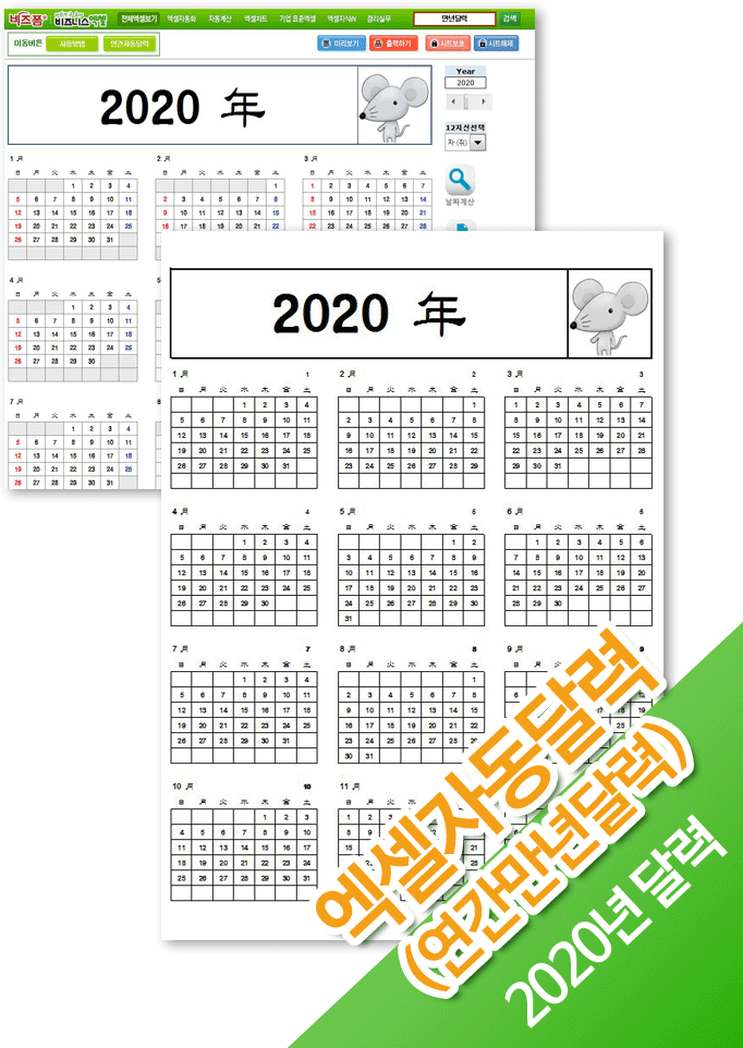 2020년 달력(엑셀자동달력,연간만년달력,12지신 자동삽입,날짜계산기 포함)입니다. 한 페이지에 1~12월까지 모두 확인 할 수 있으며, 년도별로 12지신을 선택할 수 있습니다. 날짜계산 버튼을 이용해 D-Day를 계산할 수 있는 엑셀달력, 만년달력, 엑셀자동화 서식입니다.