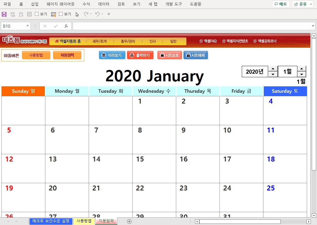 2020년 엑셀자동달력입니다. 월별, 일별에 스케쥴 및 일정을 입력하여 관리할 수 있습니다. 기록된 일정을 누적관리를 할 수 있으며 미리보기 및 출력하기를 할 수 있습니다.