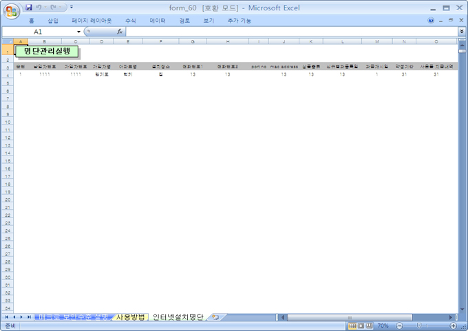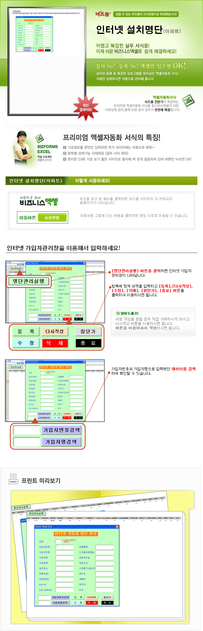 9,000원/월아파트에 설치되어 있는 인터넷 명단을 등록,검색,수정,삭제 등을 통하여 관리할 수 있도록 만든 자동화서식입니다.
