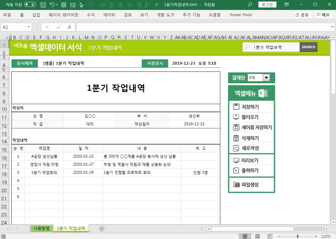 1분기작업내역입니다. 성명, 부서, 직급, 작성일자, 순번, 작업명, 일자, 내용, 비고 등으로 구성되어 있습니다. 작성 건별로 데이터 누적, 저장, 수정, 불러오기, 별도 파일로 저장이 가능한 엑셀 데이터 서식입니다.