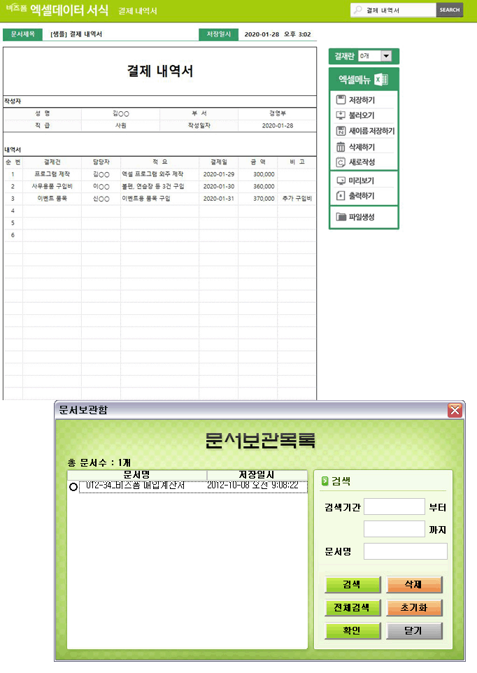 결제내역서입니다. 성명, 부서, 직급, 작성일자, 순번, 결제건, 담당자, 적요, 결제일, 금액, 비고 등으로 구성되어 있습니다. 작성 건별로 데이터 누적, 저장, 수정, 불러오기, 별도 파일로 저장이 가능한 엑셀 데이터 서식입니다.