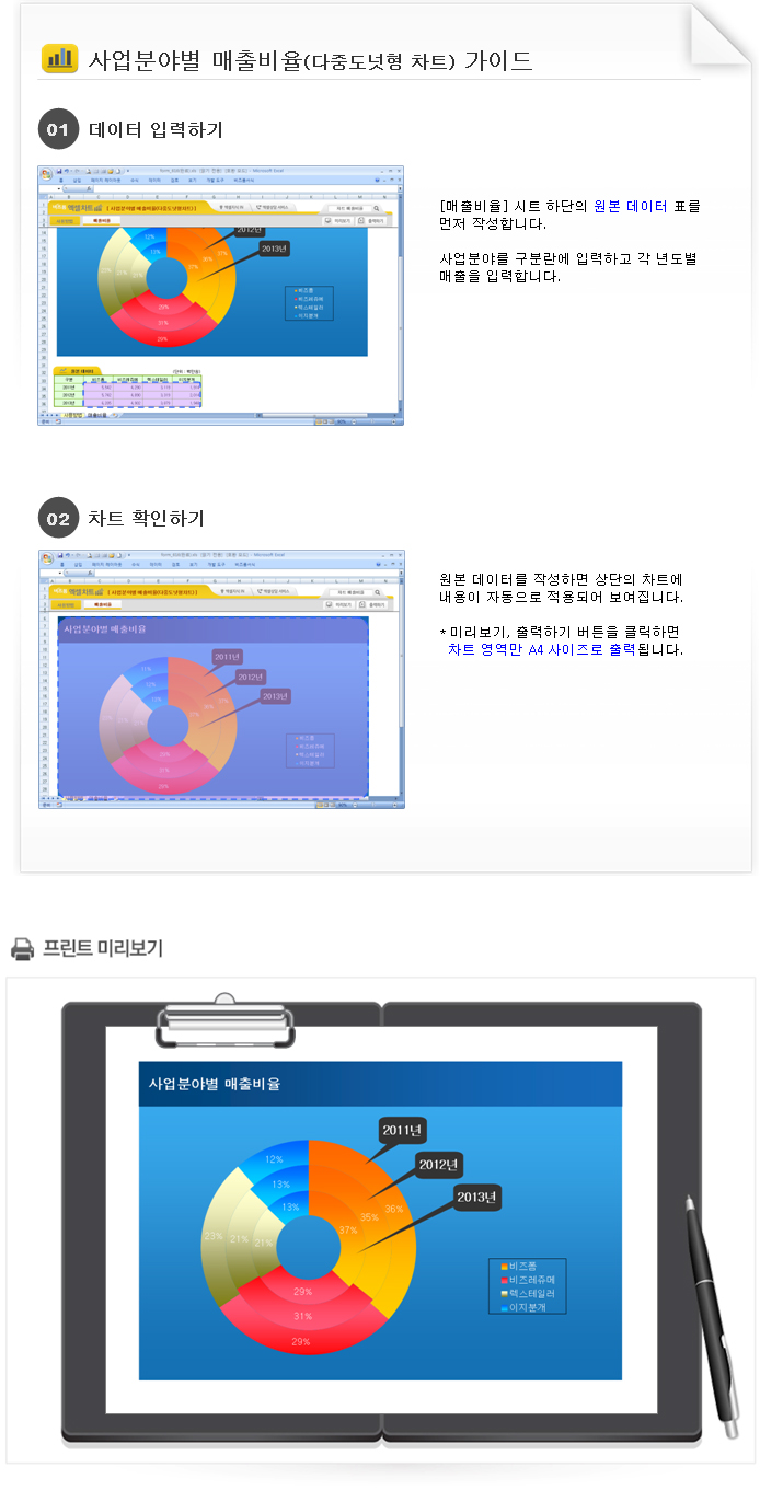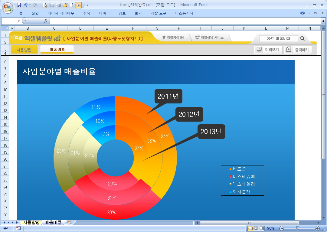 9,000원/월년도별/사업분야별 매출을 입력하면 다중 도넛형 차트에 백분율로 표시되는 엑셀통계차트입니다.