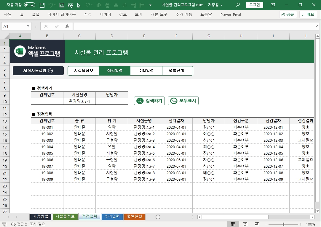 시설물 관리 프로그램(시설물정보, 점검입력, 수리입력, 월별현황)입니다. 시설물을 점검한 내역 및 수리한 내역을 입력하고 월별 현황을 확인할 수 있습니다. ※ 프로그램 규격 : MS오피스 엑셀 2013 이상※ 프로그램 구성 : 사용방법, 시설물정보, 점검입력, 수리입력, 월별현황